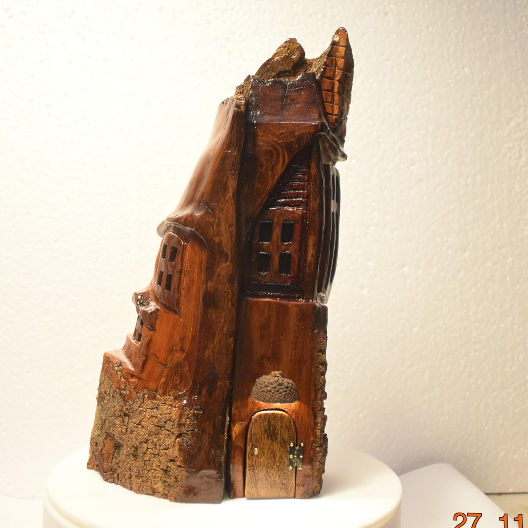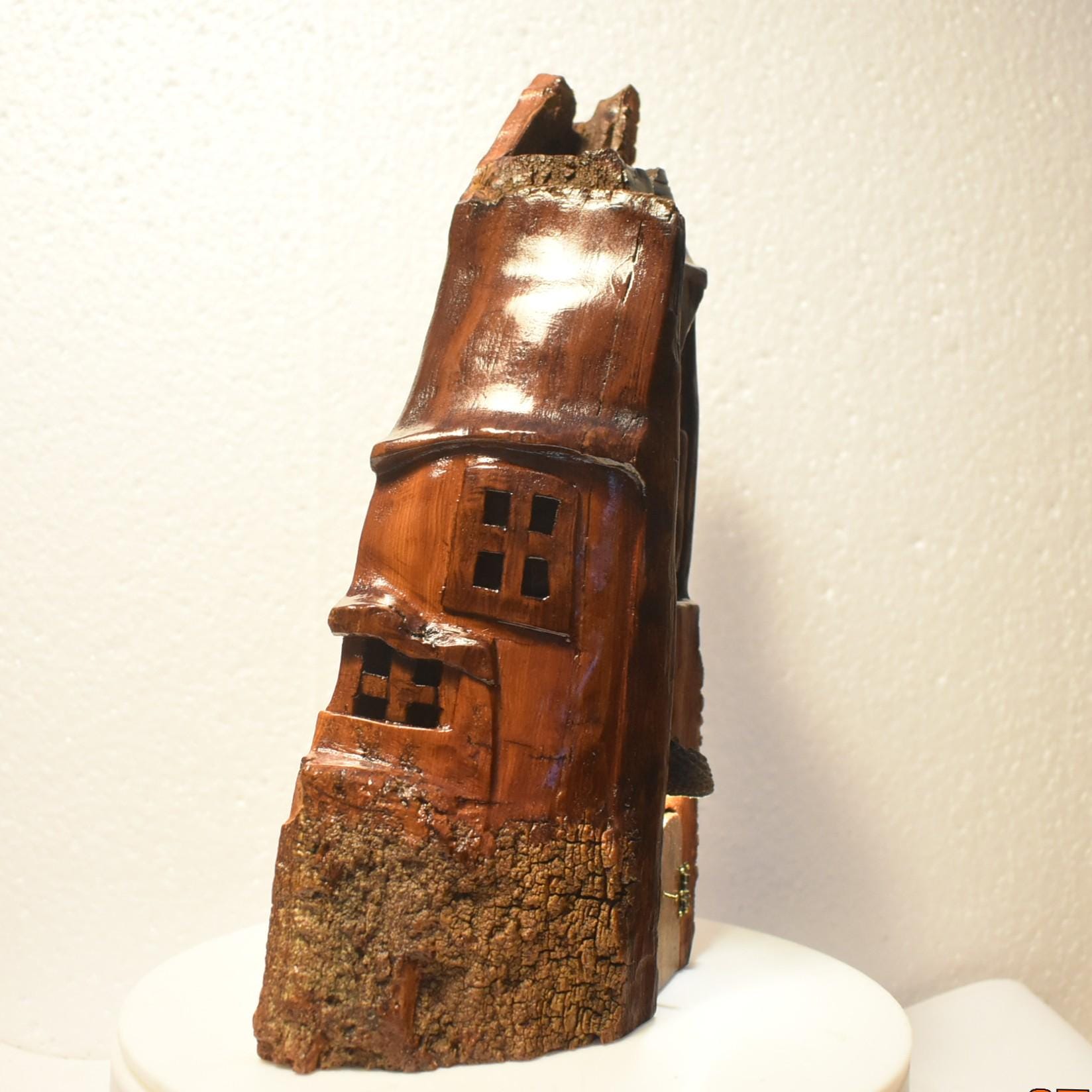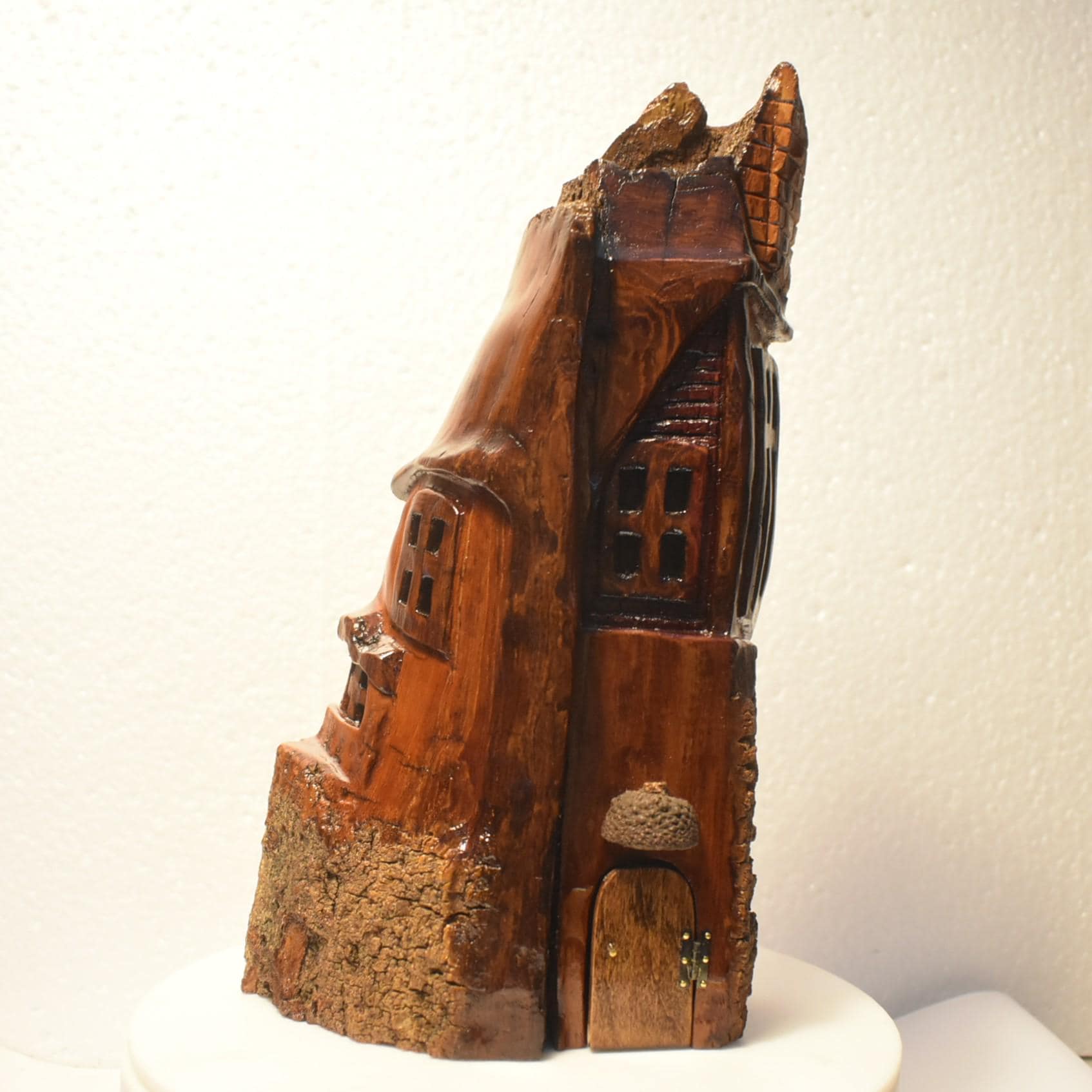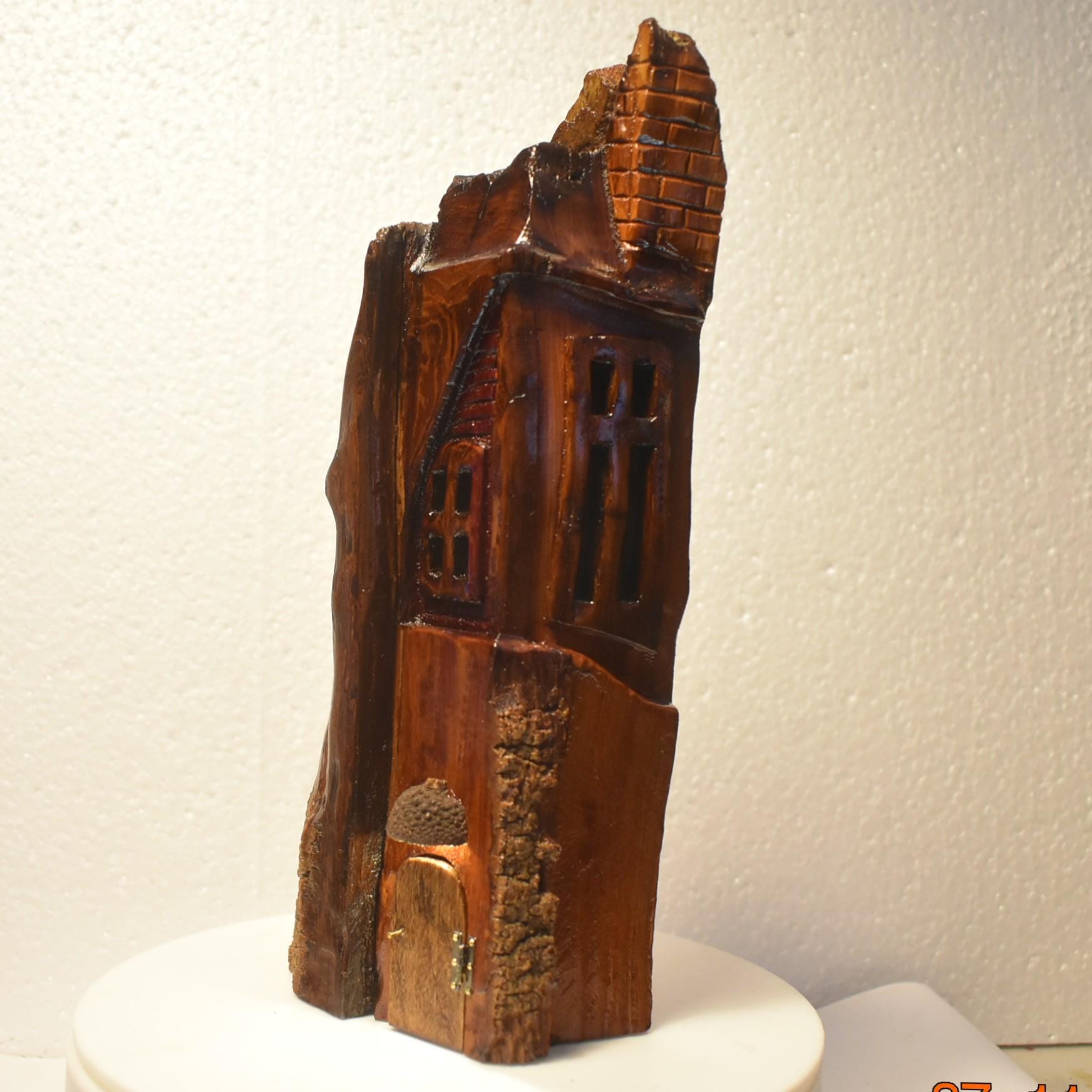 One of a kind Hand Carved cottonwood bark Wee folk home with battery operated porch light. 10 x 5 x 2.5