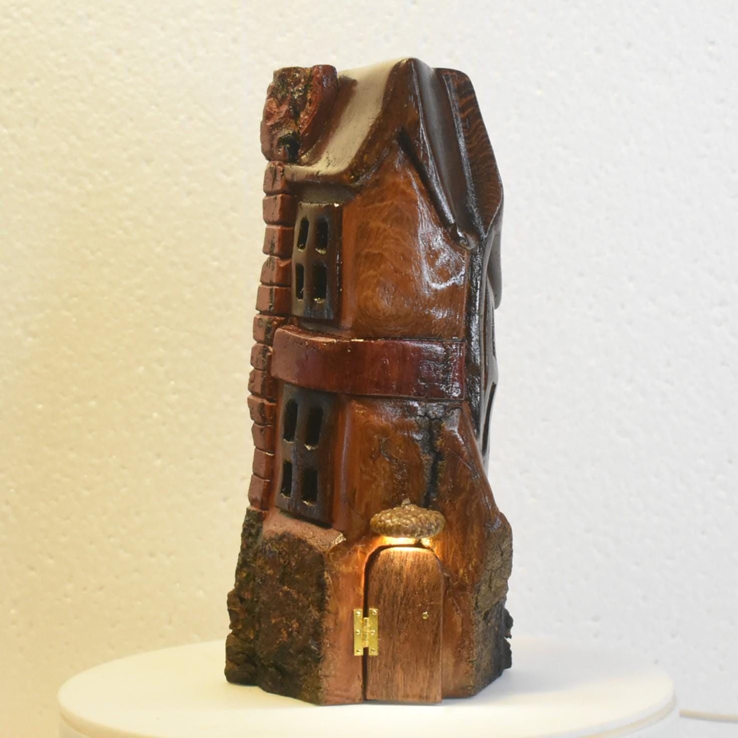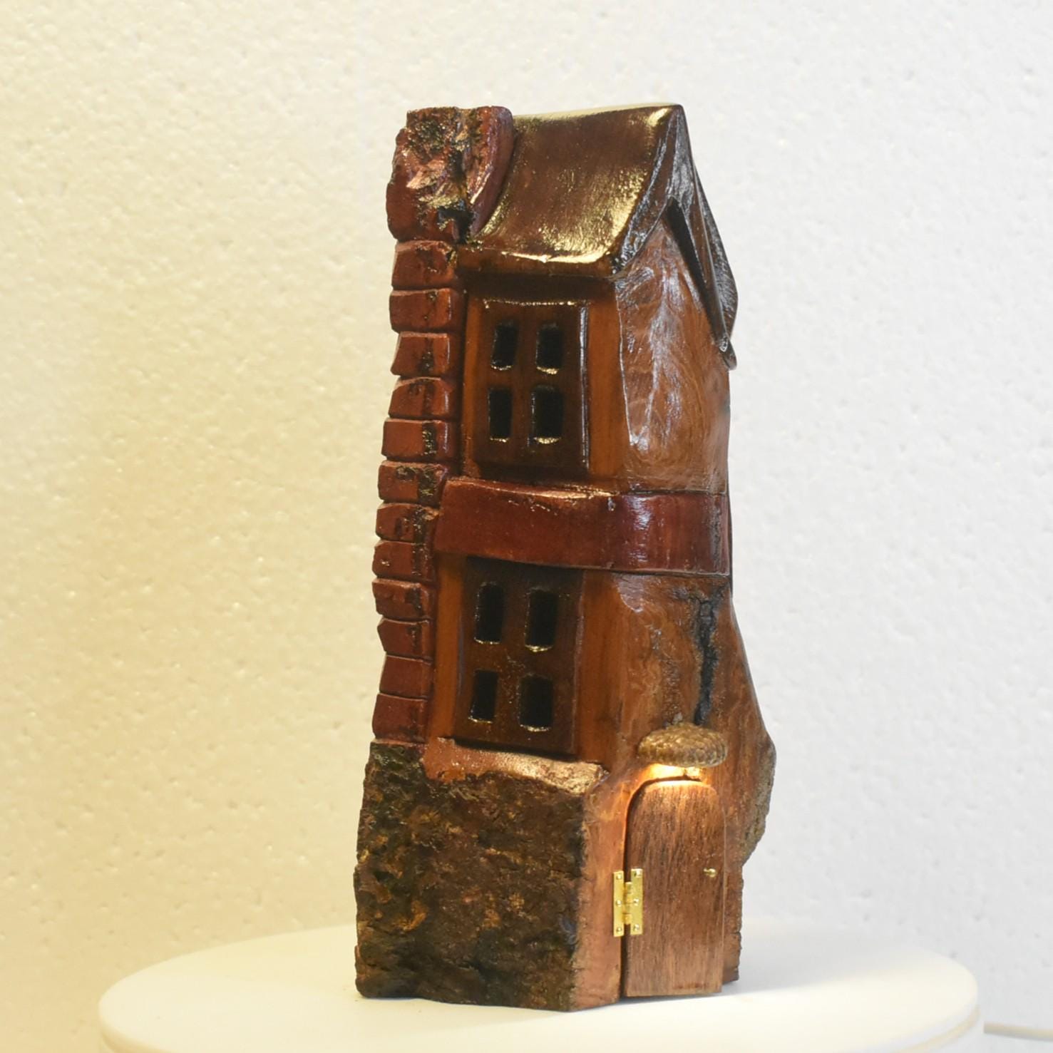 One of a kind Hand Carved cottonwood bark Wee folk home with battery operated porch light. 8.5 X 4 X 2.5